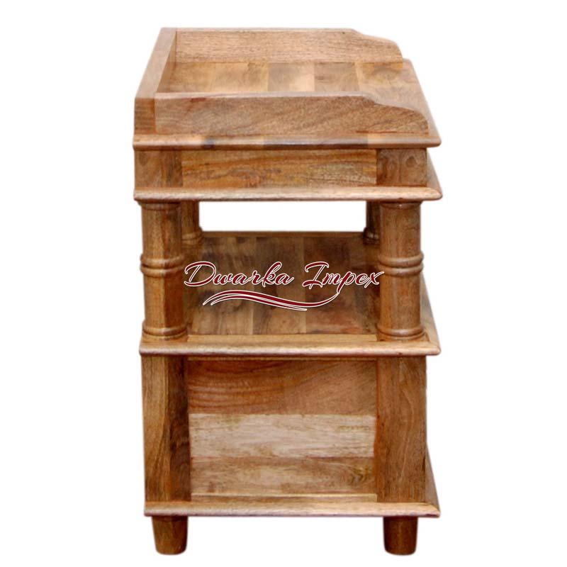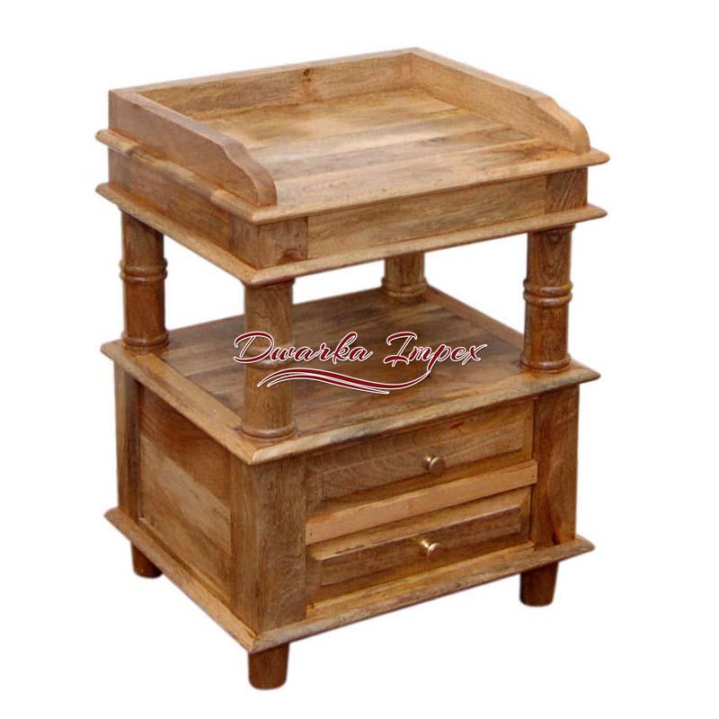 Make your home look wonderful with Brown Wooden Bedside Table with pillars. The exquisite wooden bed room furniture has two drawers, and has four tiny artistic to uphold a roof. You can put decorative on the roof and add more beauty to it.