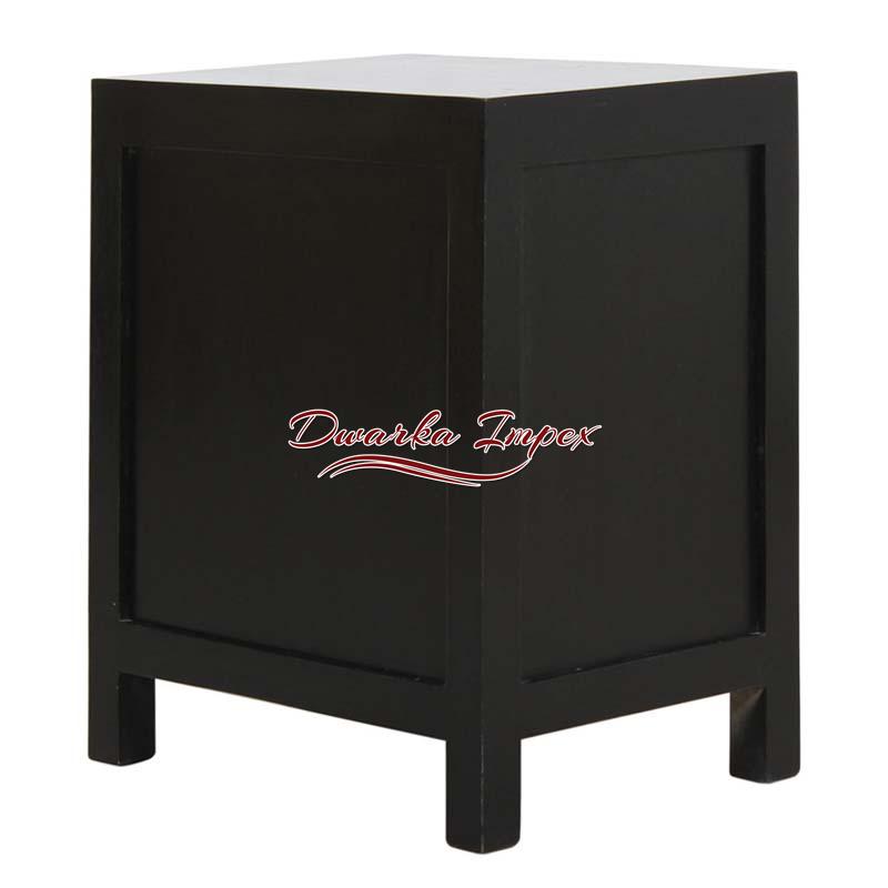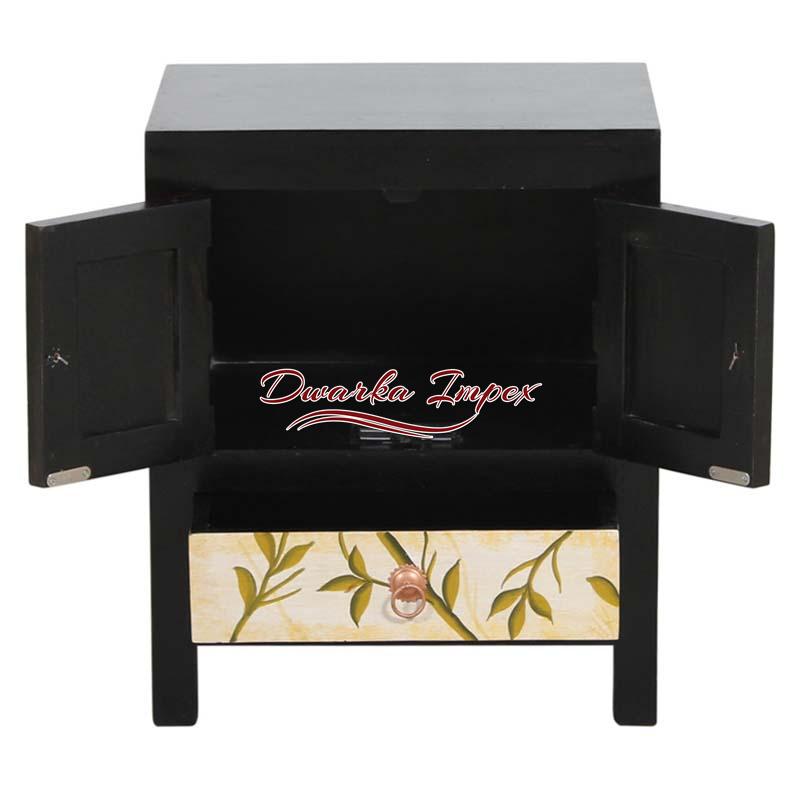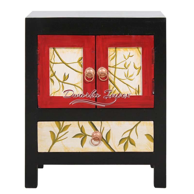 Colorful Wooden Bedside Table with Leaf Design is perfect to male your bedroom look agile and energetic. The wooden bedroom furniture has black body and one cabinet with red doors. What make it look amazing is the leaf design front panel which is quite impressive.