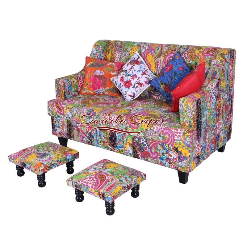 Perfect double seated sofa in subtle yet elegant multi hues and patterns with two matching foot rests! Perfect to be placed in any room!
