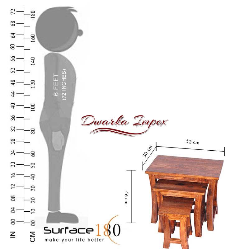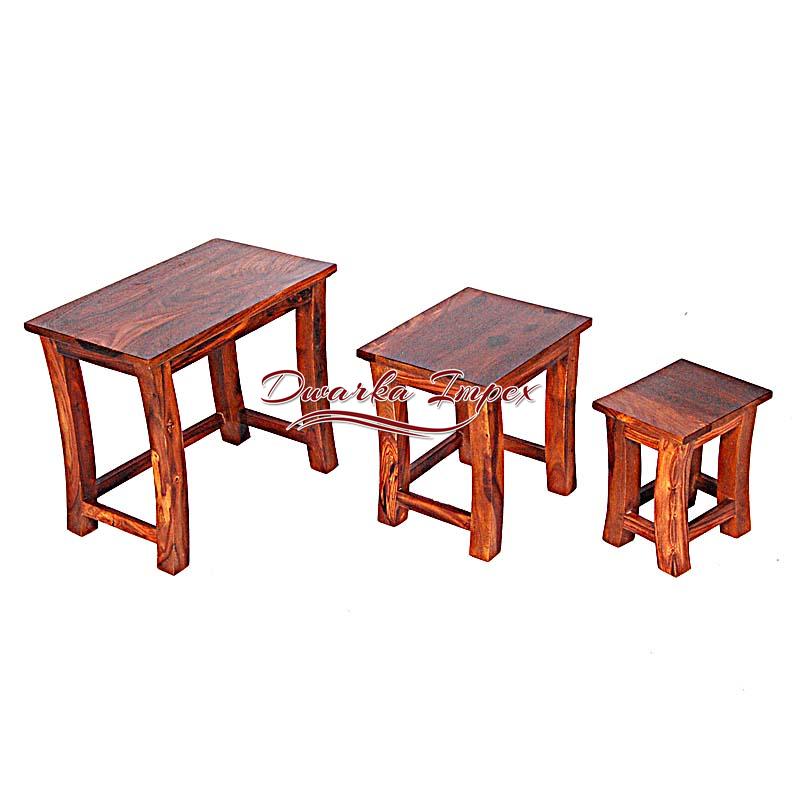 Flounce the corners of your living room by filling the space with the Nest of table in a set of three. The specially crafted different sizes are meant for adding a variety of lustre to your theme room. The wood work is of the phenomenal quality with the strength and beauty. The bottoms of the table are smoothly finished just to rest unaffected any kind of surface. The mild arch in the pillars of the tables is designed to add grandeur.