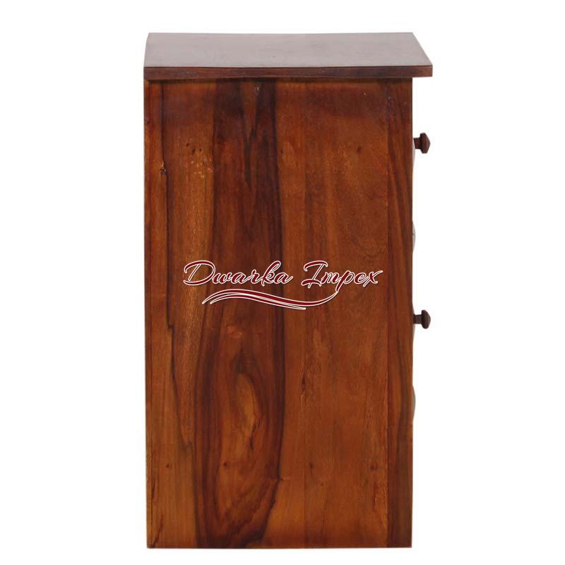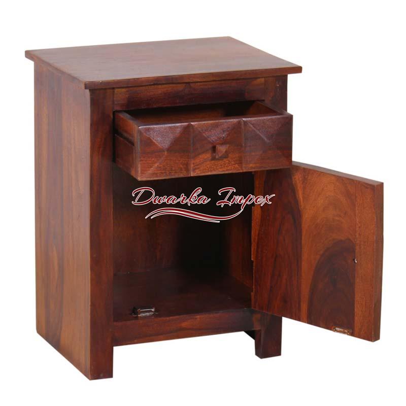 Spectacular Wooden Bedside Table is crafted in unique style and pattern. The wonderful bedroom furniture has pyramid-like structures at front panel, and has remarkable wooden finish on exterior. It would look perfect with both traditional and modern bed.