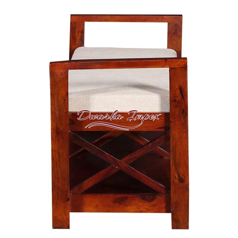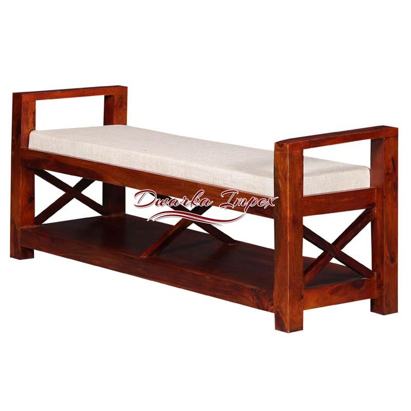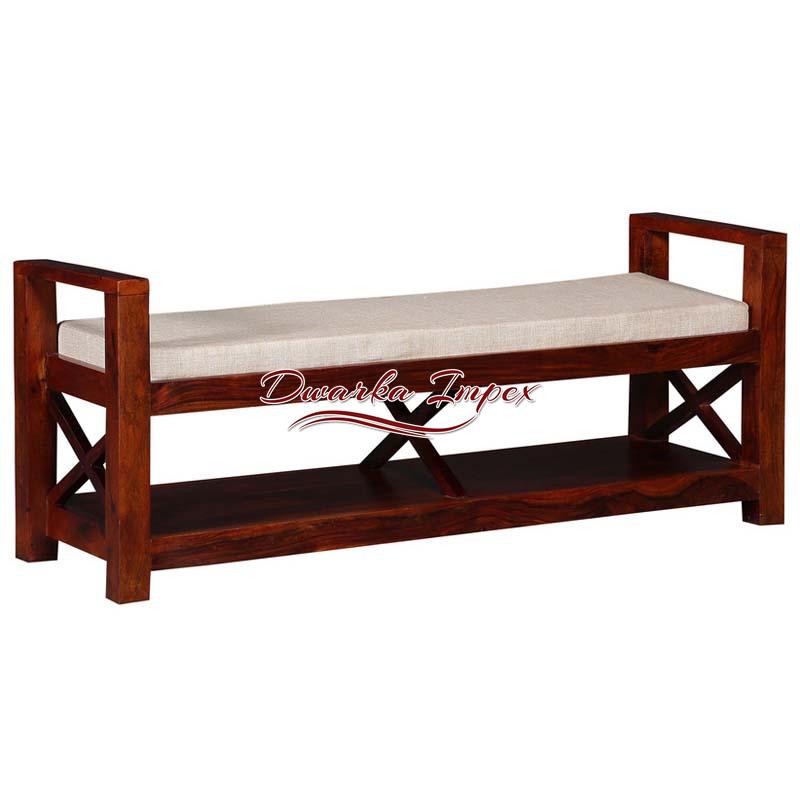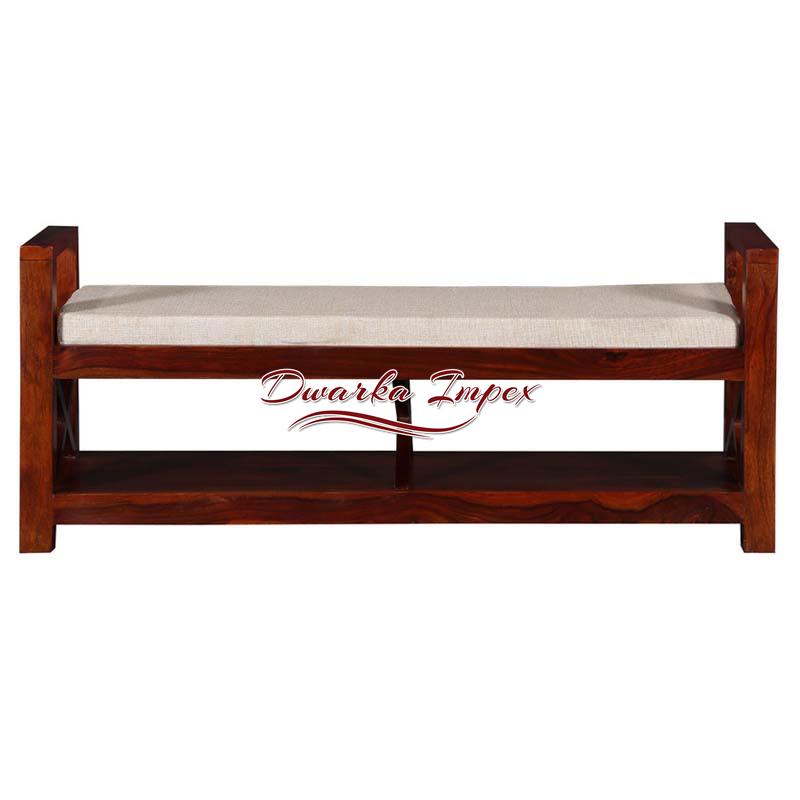 Get this Spectacular wooden bench for your living room and make it look sophisticated. The beautiful bench has elegant support on both sides and comes with a shelf beneath the seat to offer you some extra storage space. It has cross-style artwork on both sides and at centre to provide support to the bench.